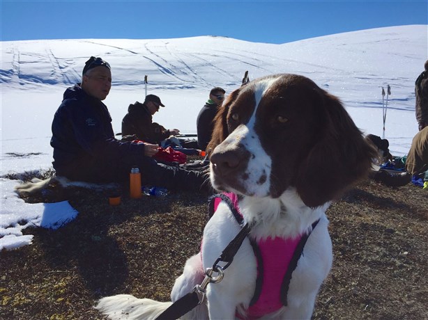 Den första dagen av tre var det Corinne som fick vara med och det gjorde hon med bravur. Detta var den varmaste av dagarna och framåt eftermiddagen blev snön ganska tung, men Corinne jobbade på fint, hittade fågel, reste friskt och stannade direkt.