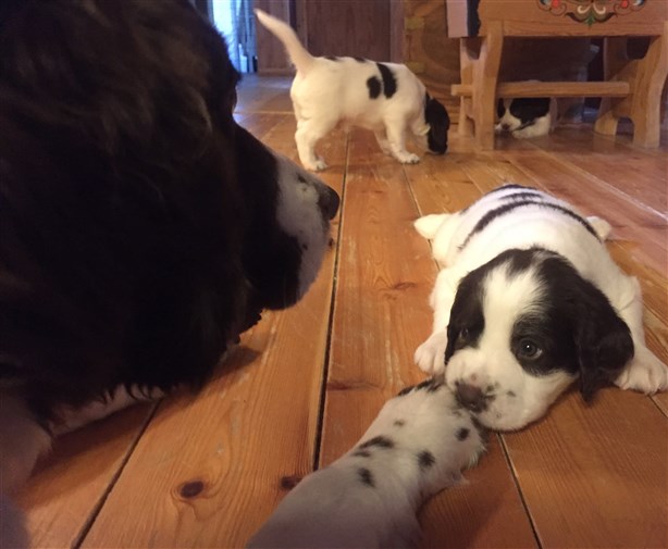Vi har fått en släng av kallt väder här i Funäsdalen - järnnätterna gör sig påminda den fjärde och femte juni med snö som yr i luften och hagelbyar. Istället för att ta ut valparna på förmiddagen blev det en upptäcksfärd i köket. Och där mamma finns där finns också mat - och där mat finns där är man som fyraveckors valp glad.
